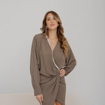 Abito Acato corto, scollo a V incrociato con dettaglio luminoso di strass lungo il bordo, gonna asimmetrica con drappeggio laterale;