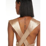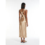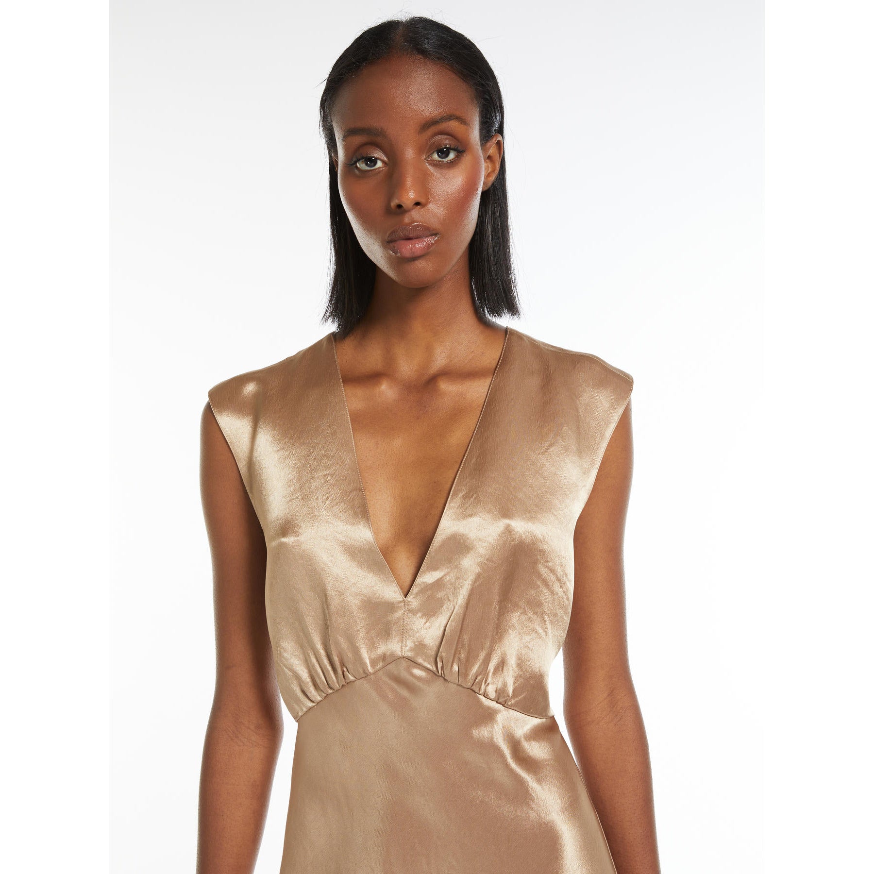 Abito lungo smanicato in raso, caratterizzato da una silhouette fluida leggermente aderente in vita e gonna pencil dal volume discreto. Il modello presenta un profondo scollo a V arricciato sul davanti e spalline larghe incrociate sulla schiena. Chiusura con zip nascosta sul retro;