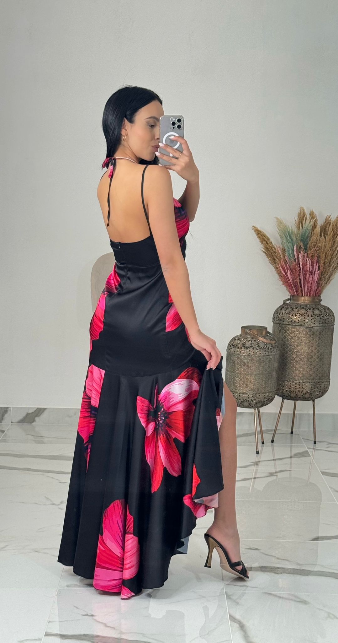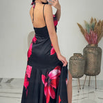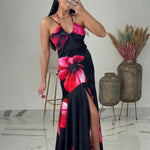 Esplora l'eleganza floreale con un tocco di mistero del nostro Abito Fiorato. Caratterizzato da un fondo nero arricchito da fiori fucsia, questo abito offre un look sofisticato e audace, perfetto per chi ama distinguersi con stile.