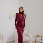 Abito lungo borgogna da donna in jersey opaco, maniche lunghe, drappeggio sui fianchi;
