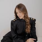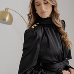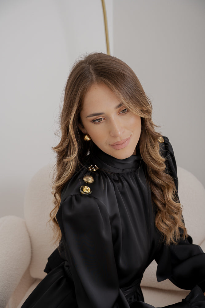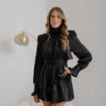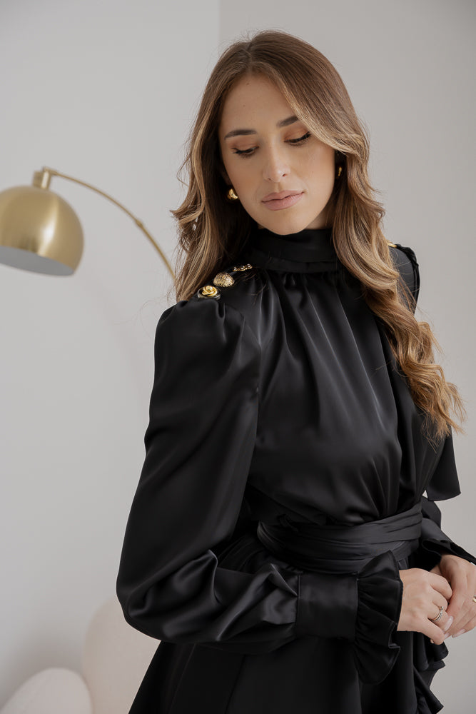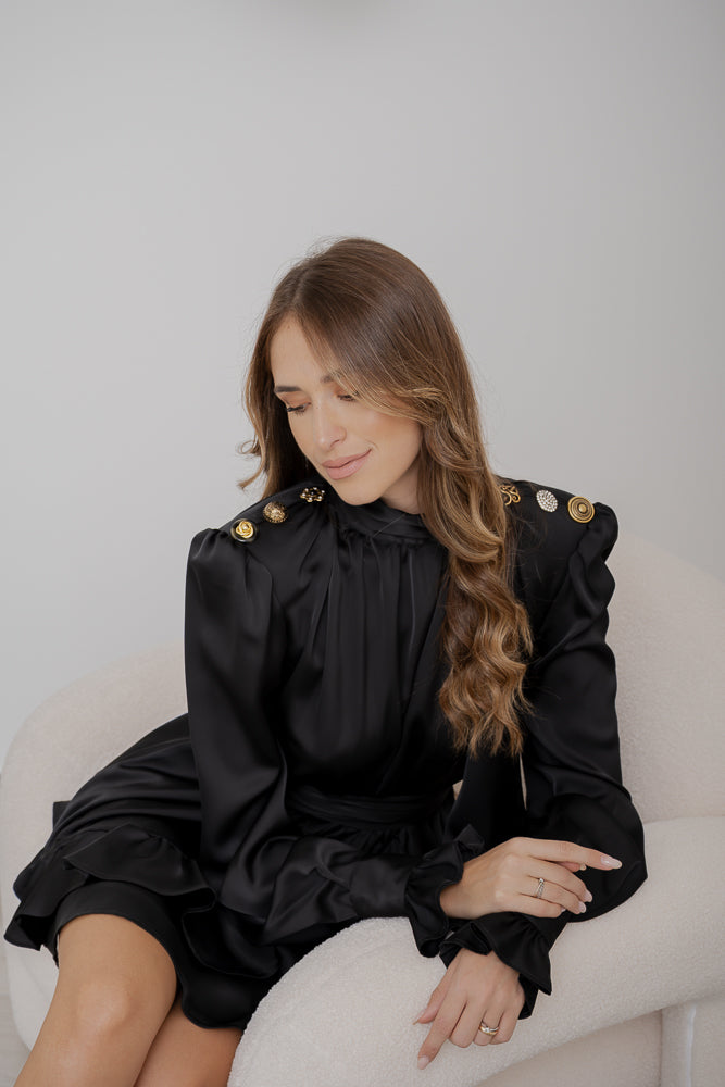 Abito corto con rouge in tessuto doppio raso, maniche lunghe e impreziosito da bottoni in metallo sulle spalline imbottite, fusciacca in vita.
