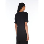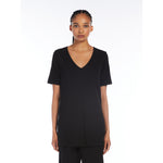T- shirt a maniche corte, realizzata in morbido jersey crèpe di viscosa. Modello dalla linea dritta e morbida con scollo a V e fondo asimmetrico leggermente più lungo sul retro con spacchi laterali. Rifinita con impunture.