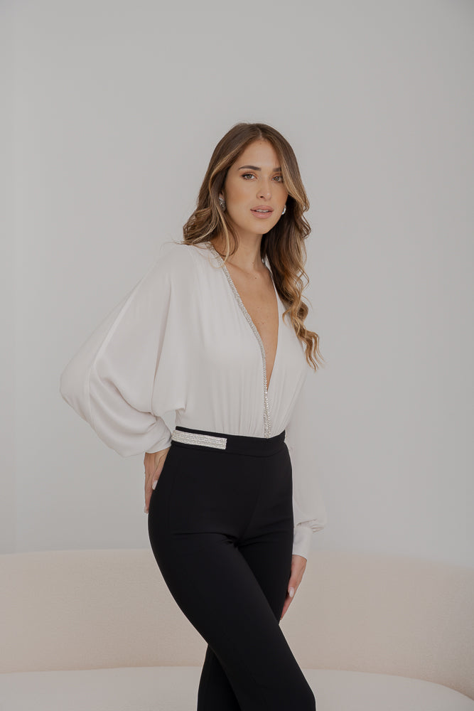 Body Baseo, profondo scollo a V incrociato con profilo impreziosito da applicazioni luminose effetto strass, maniche lunghe sono ampie e morbide, con polsini alti e bottoncini.