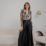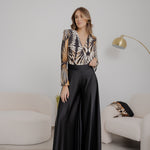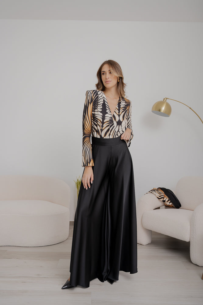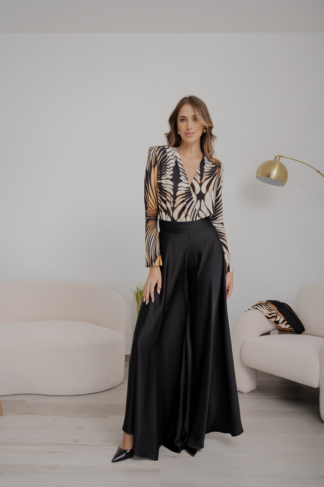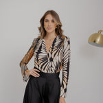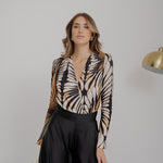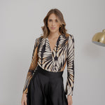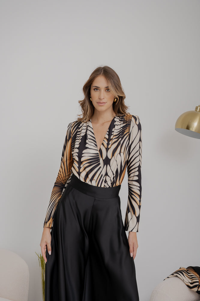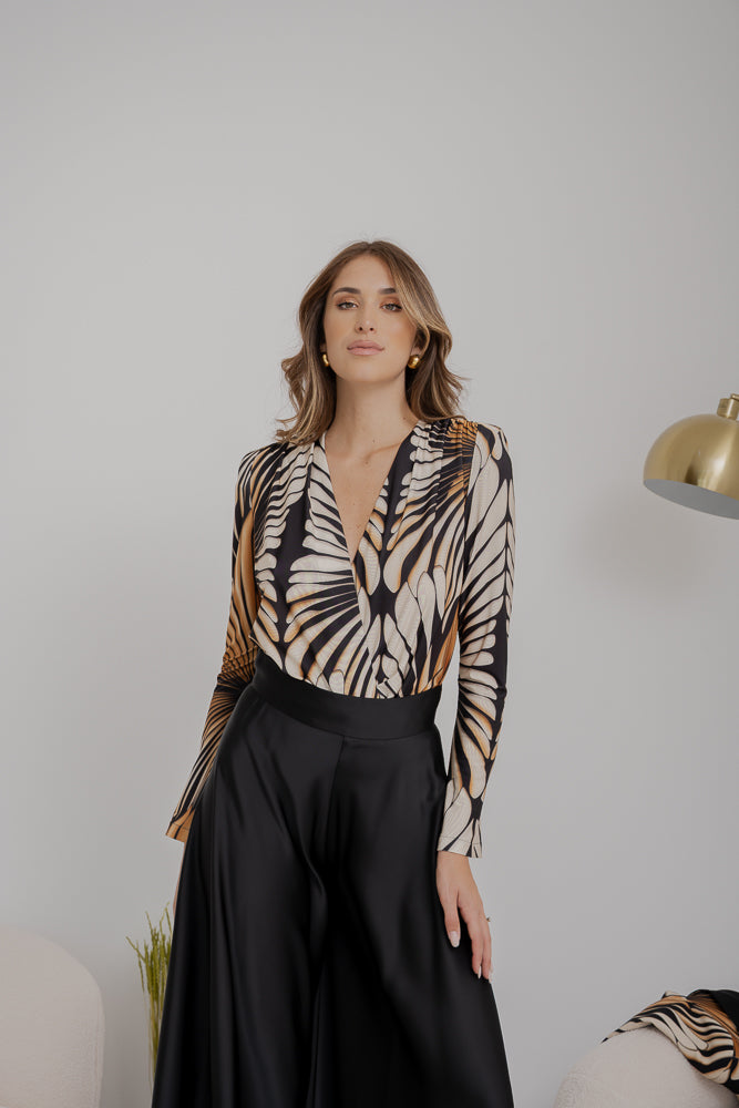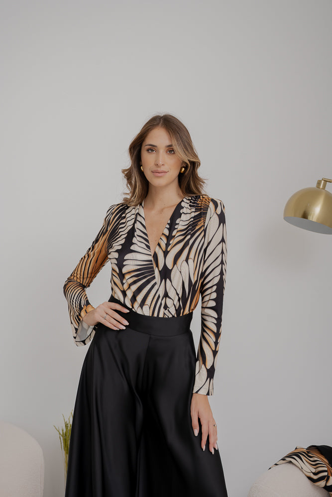 Body in jersey, fantasia pavone, maniche lunghe e scollo profondo.