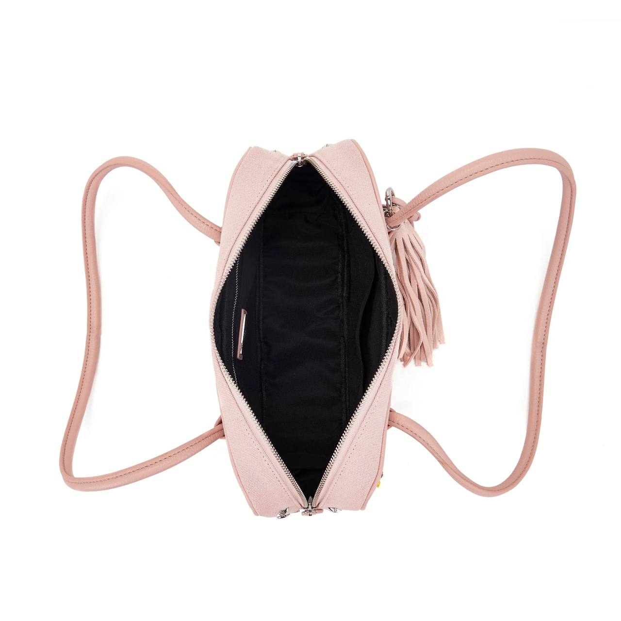 Borsa a mano in tessuto con spille multi color applicate, lunghi manici e chiusura a zip.