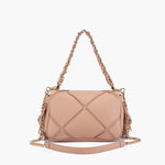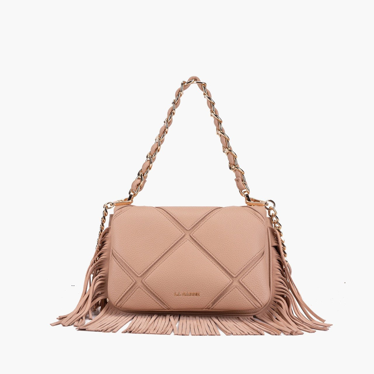 Borsa a spalla in ecopelle con lavorazione a rombi cuciti e frange, manico in catena infilato in ecopelle e tracolla rimovibile.