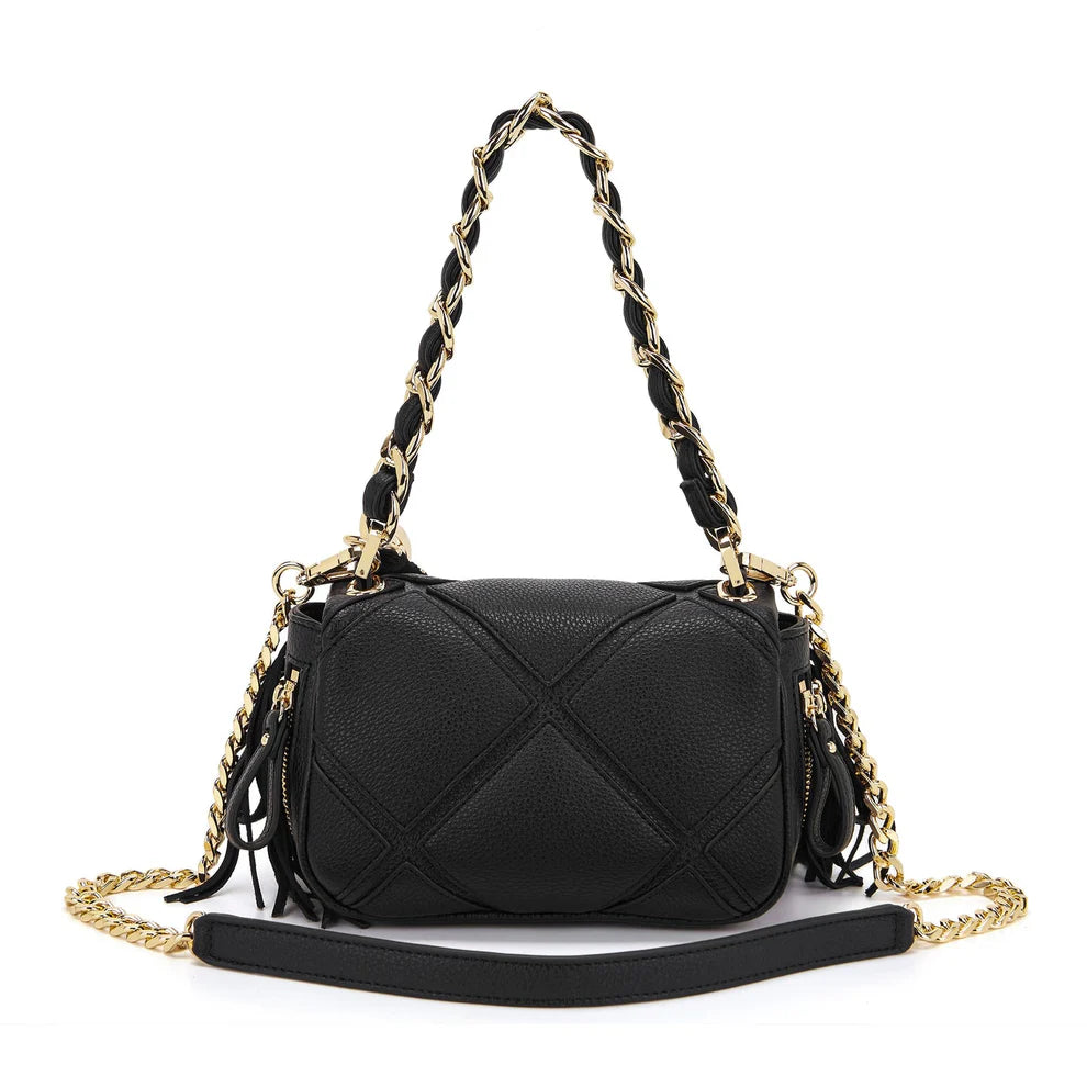 Borsa a spalla grande, La Carrie, in ecopelle con lavorazione a rombi cuciti e frange, manico in catena infilato in ecopelle e tracolla rimovibile