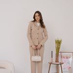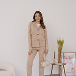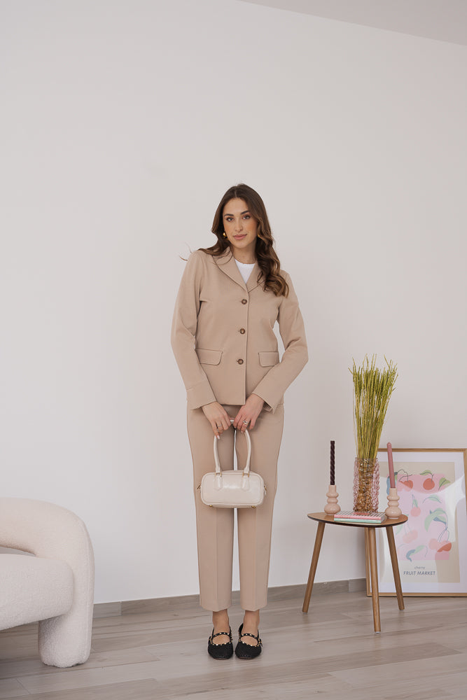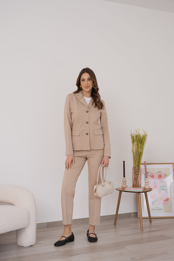 Ha una chiusura con bottoni, scollo con revers e tasche con pattina che enfatizzano il punto vita.