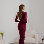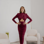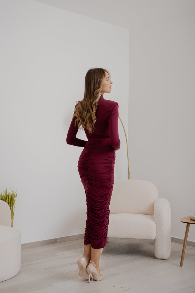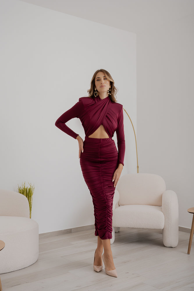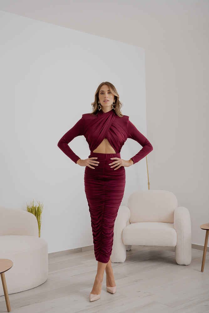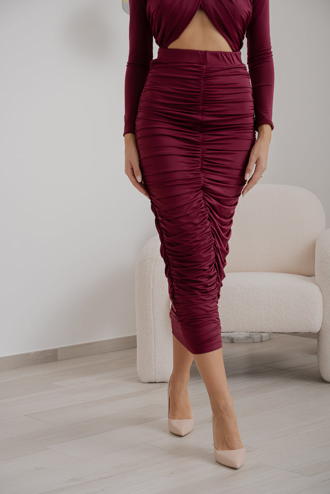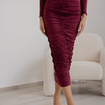 Gonna tubino, caratterizzata da una linea aderente drappeggiata che esalta la silhouette e dalla chiusura con zip posteriore