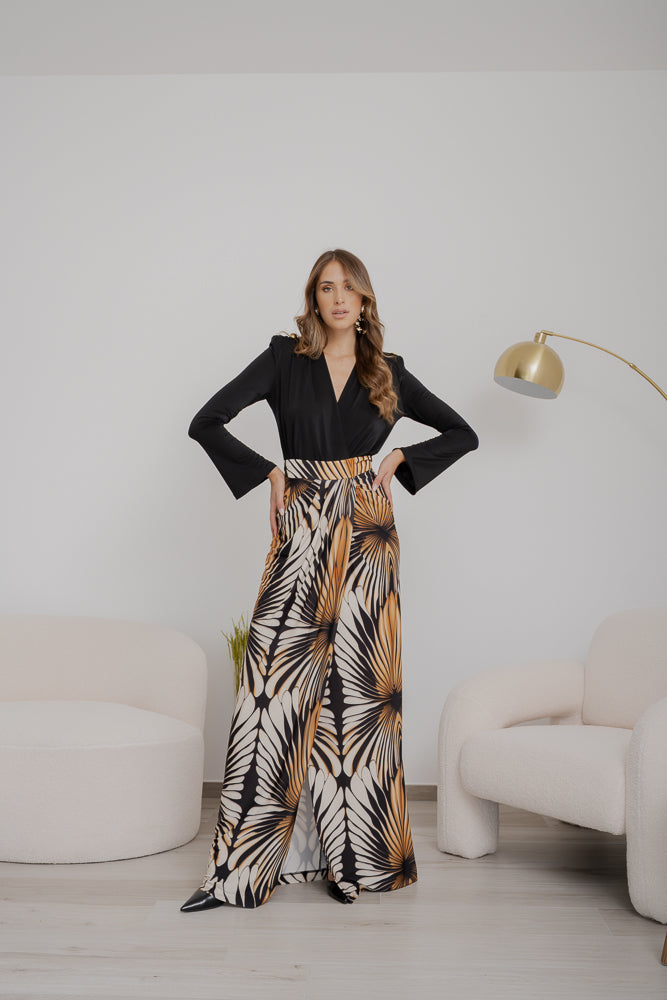 Gonna in jersey, fantasia pavone, modello a matita con spacco sul davanti.