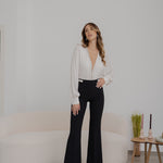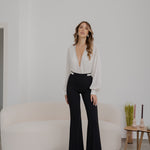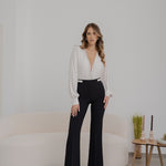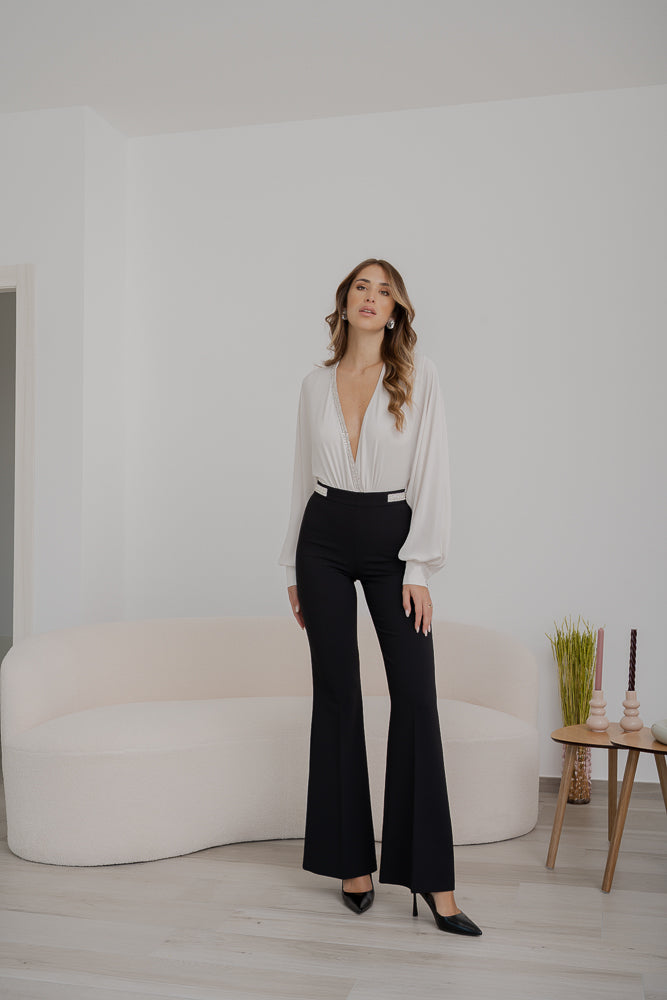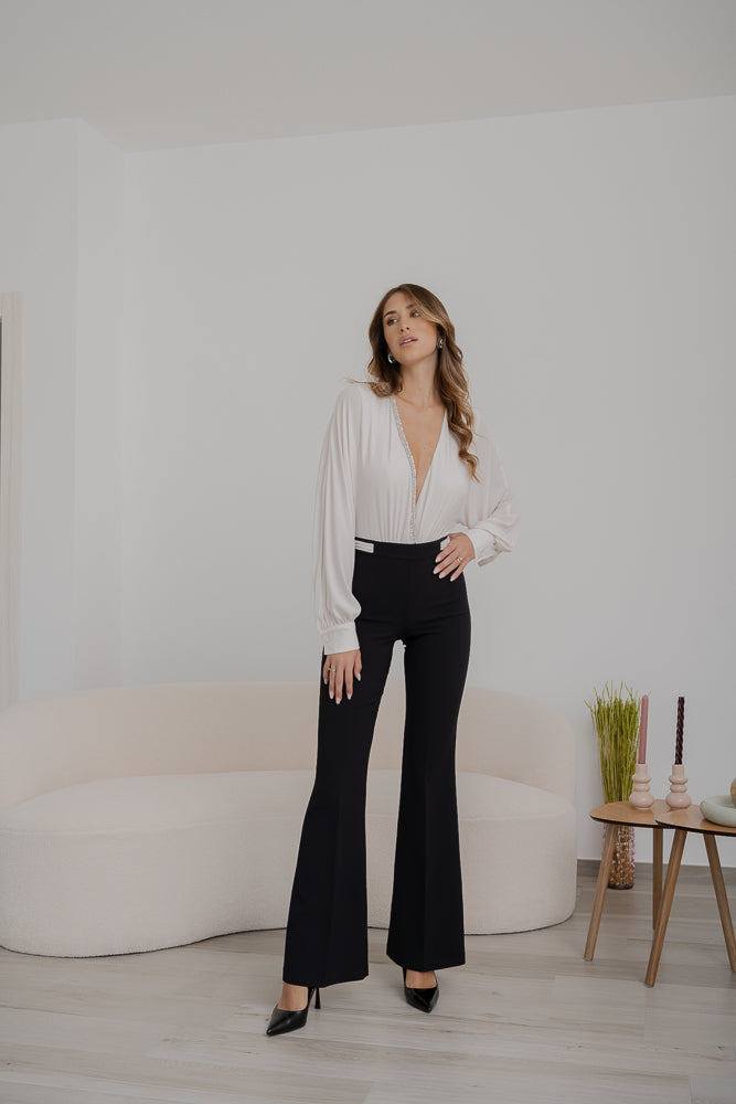 Pantalone Pasia, gampa leggermente a zampa, vita alta valorizzata da dettagli gioiello applicati sui passanti;
