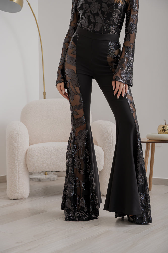 Pantalone luxury realizzato in doppio tessuto con pannelli laterali in tulle ricamato con paillettes, linea aderente sulla coscia e ampia sul fondo, effetto trasparente ai lati, chiusura con zip invisibile posteriore.