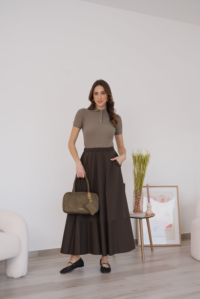 MM MAX MARA Polo slim in cordonetto di cotone verde militare con maniche corte, Taglio dritto che consente libertà di movimento. Colletto morbido e chiusura con bottoni corti. Polsini e orlo rifiniti con un comodo cordino elastico. - Lunghezza: 51 cm. - Larghezza sotto l'ascella: 40 cm. - Misure per la taglia: S.