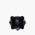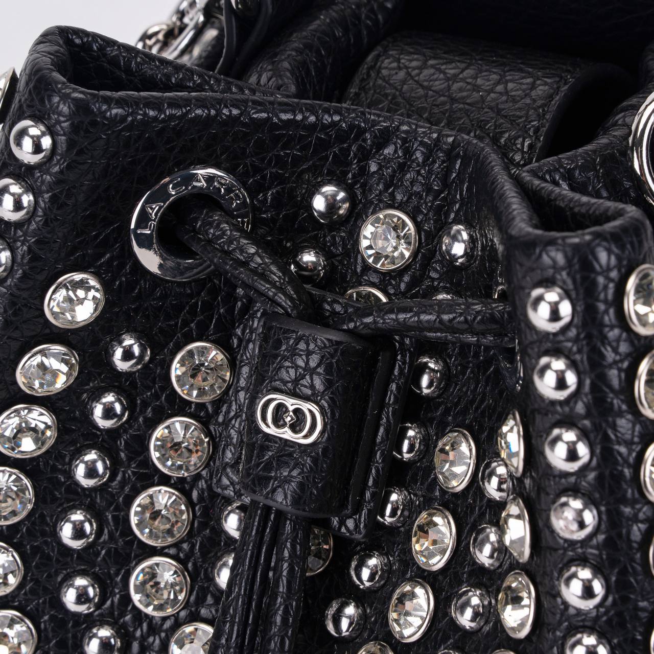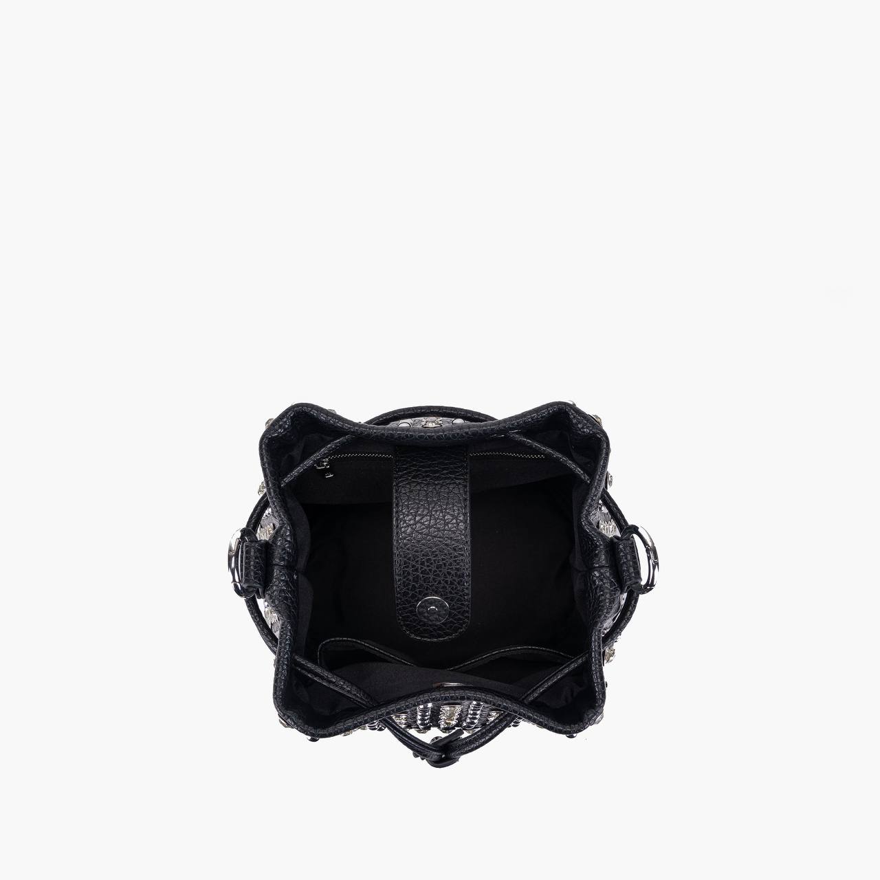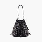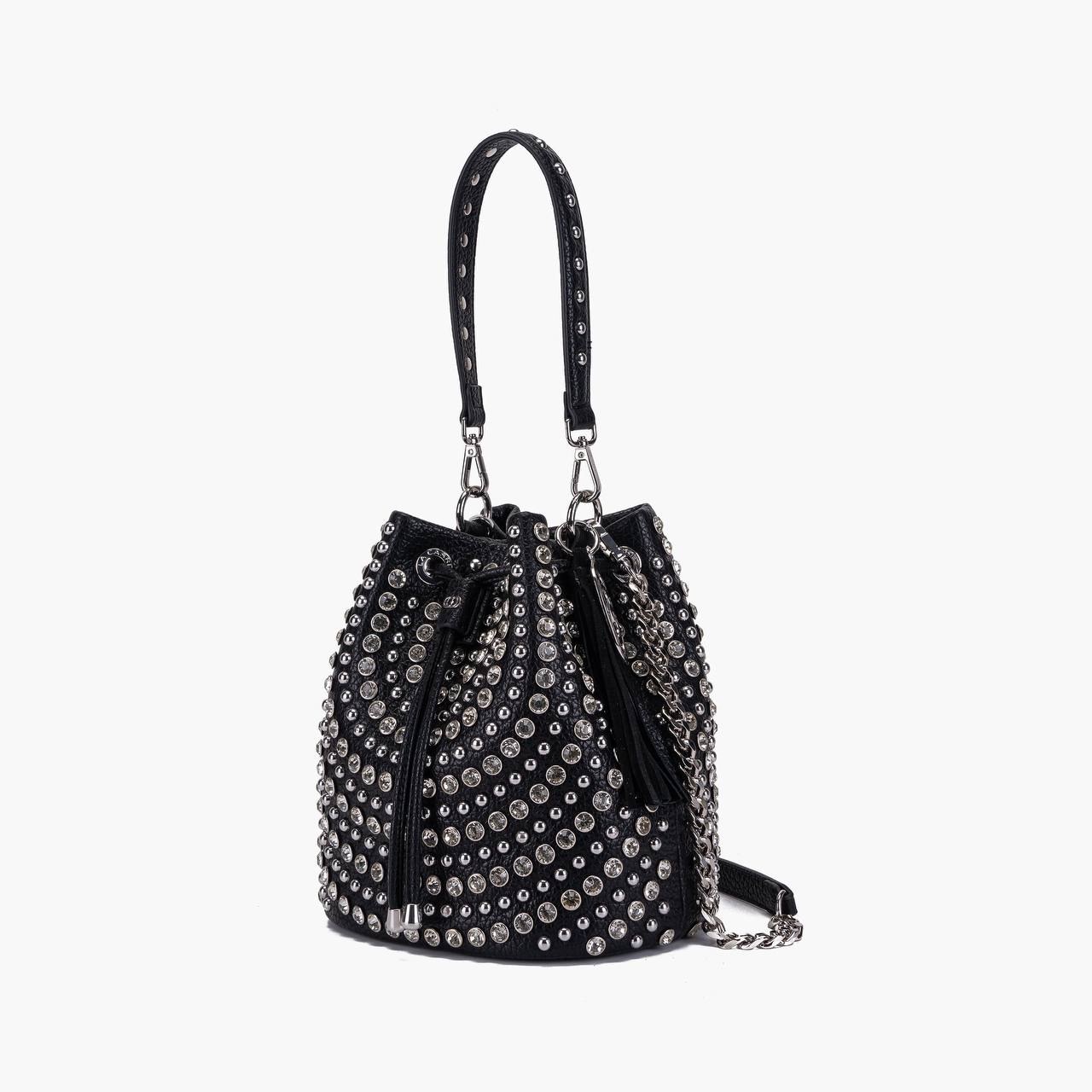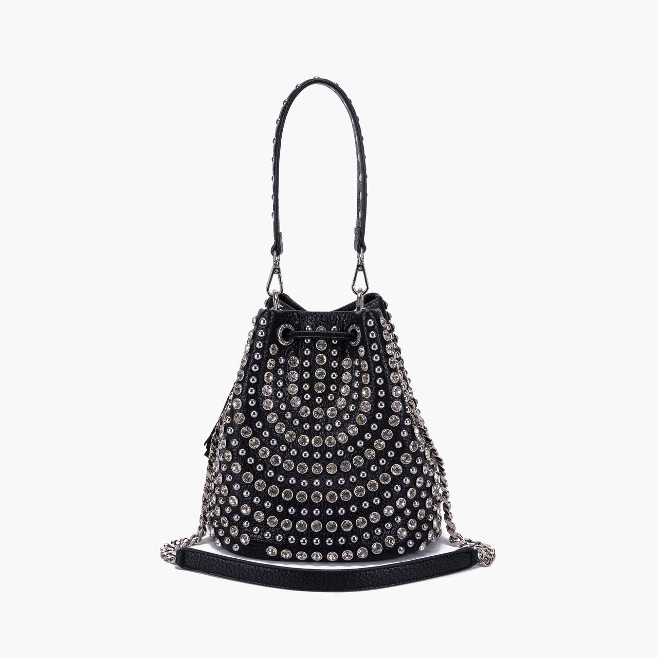 Secchiello in ecopelle con applicazioni di borchie e strass, manico e tracolla catena rimovibili.