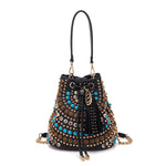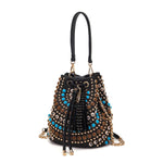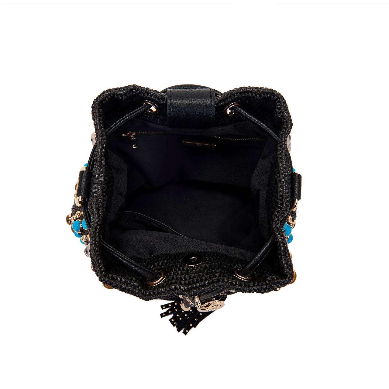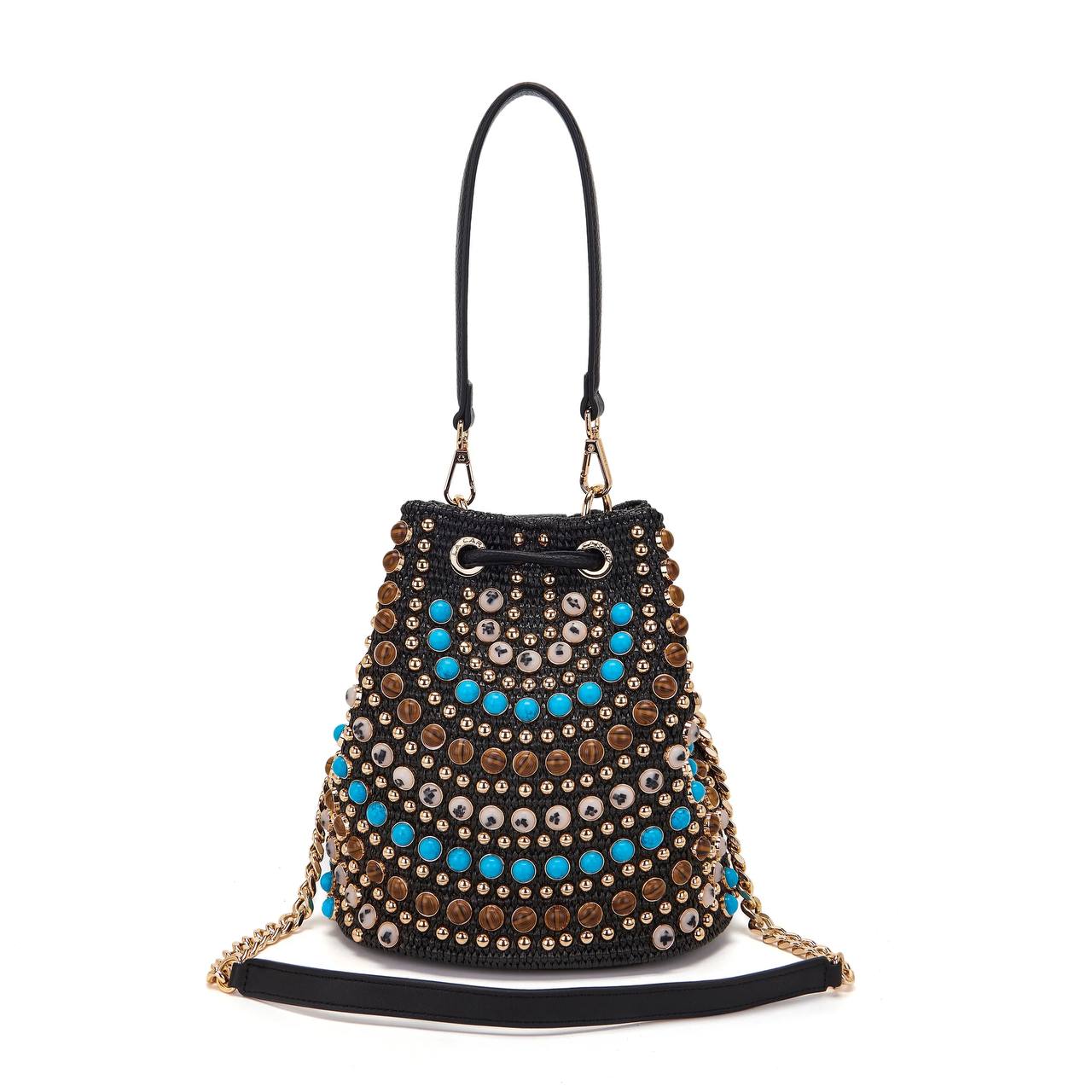 Secchiello in raffia e PU con applicazioni di borchie e pietre dure con cabochon; manico e tracolla rimovibili.