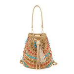 Secchiello in raffia e PU con applicazioni di borchie e pietre dure con cabochon; manico e tracolla rimovibili.