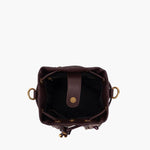 Secchiello in ecopelle effetto martellato con borchie in oro , tracolla catena e manico rimovibile.