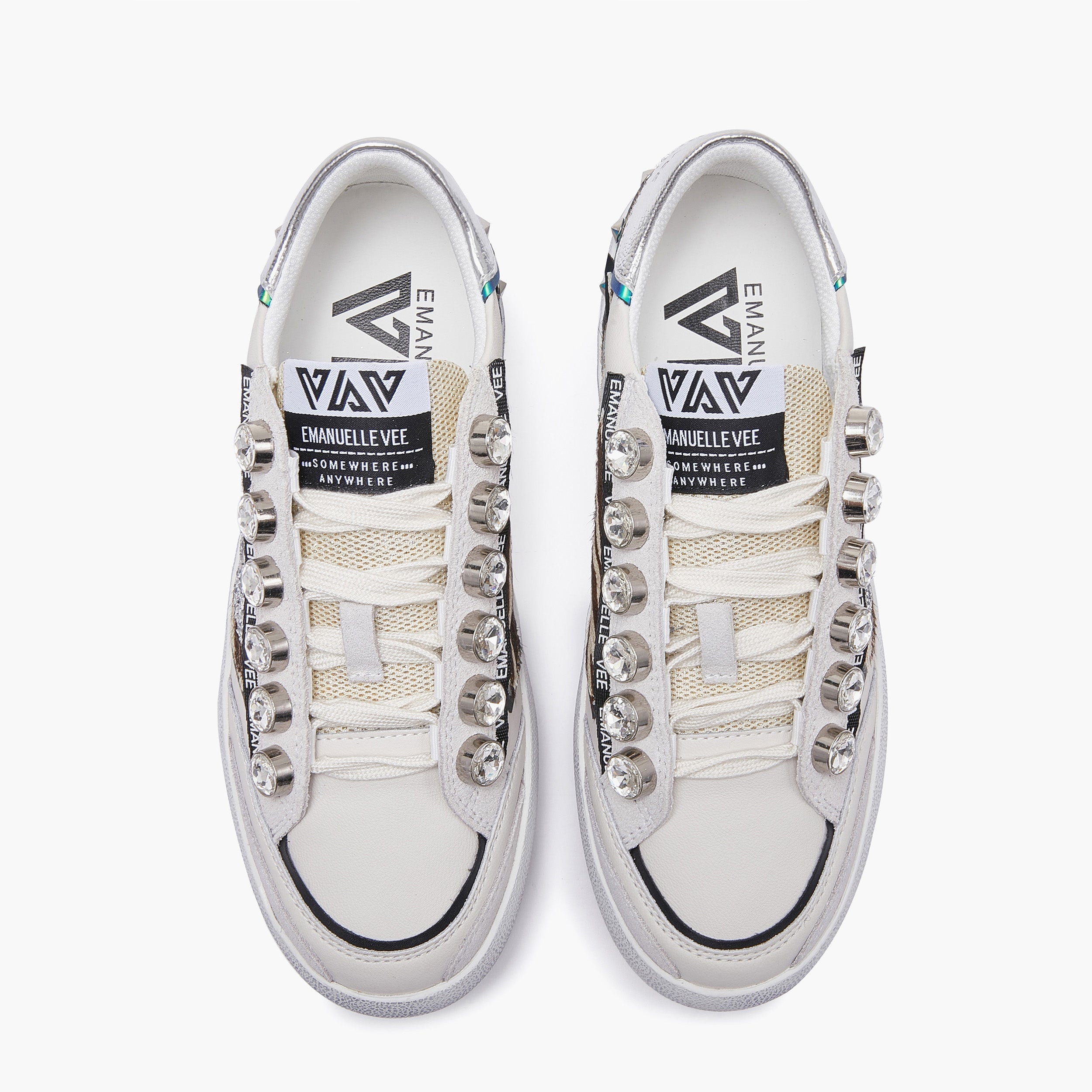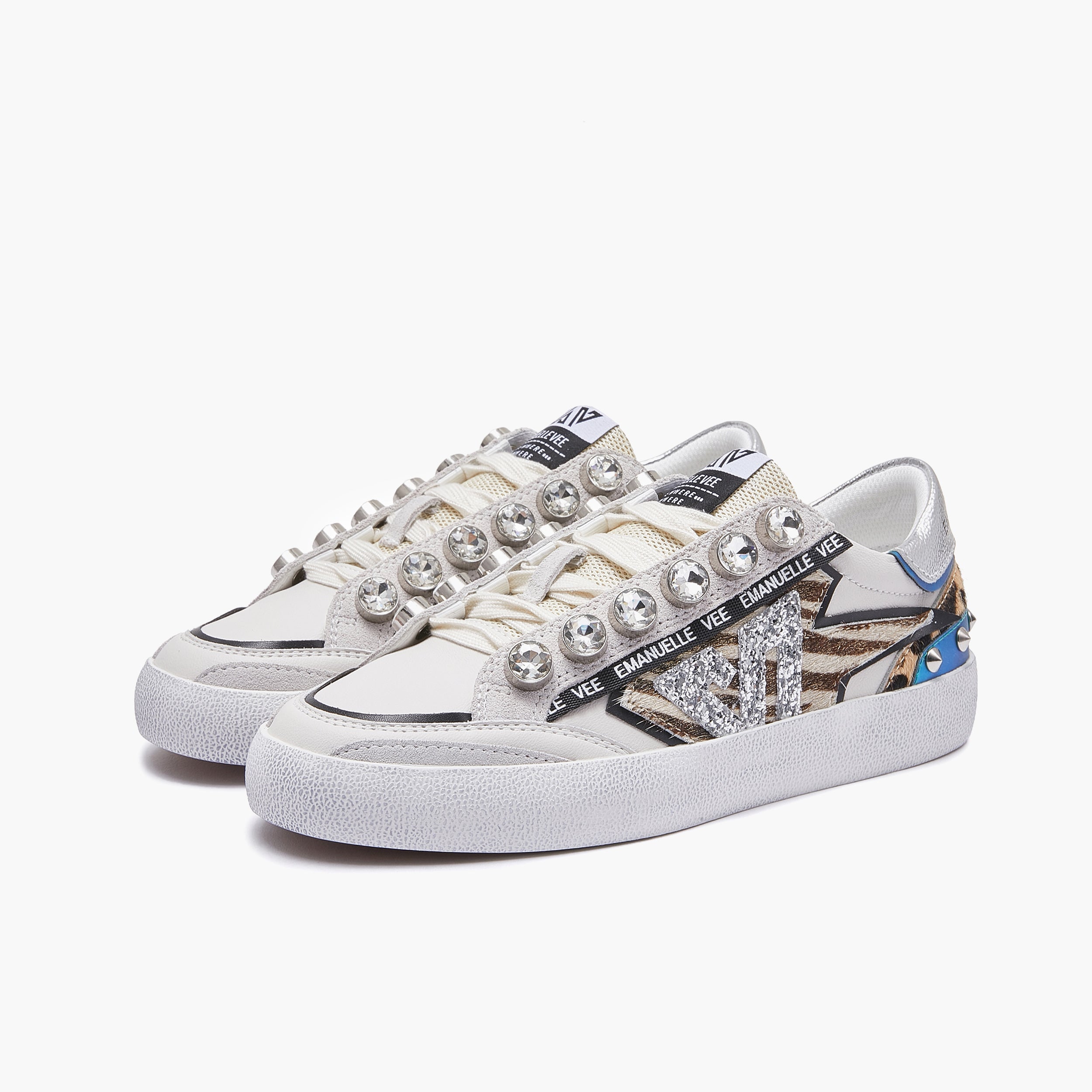 Sneakers OLIVIA, a cassetta in pelle, mix di materiali e colori, dettaglio strass nell'allacciatura, suola in gomma