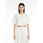 T-shirt in morbio jersey interlock, caratterizzata da un taglio cropped in vita e maniche corte a giro. Il modello è personalizzato con logo MM ricamato in filo sul retro del collo.