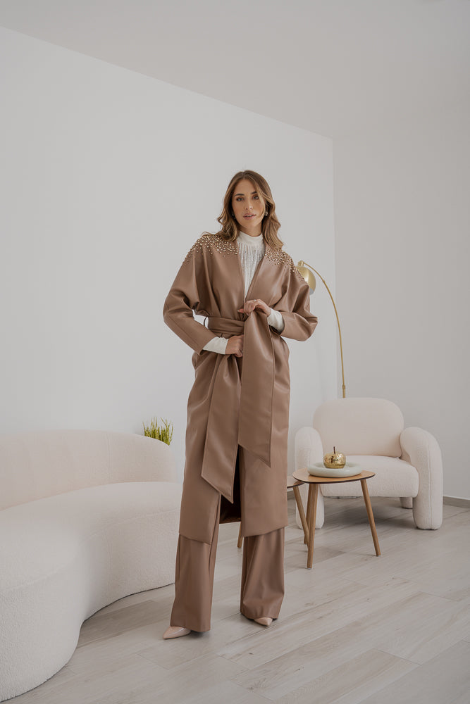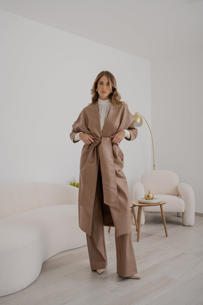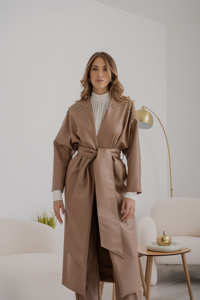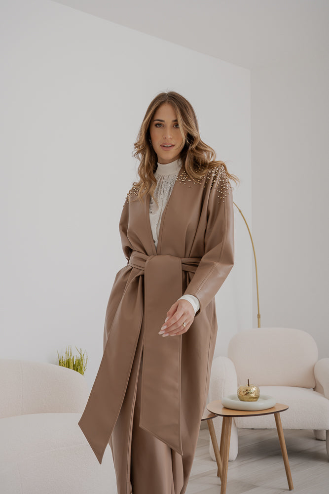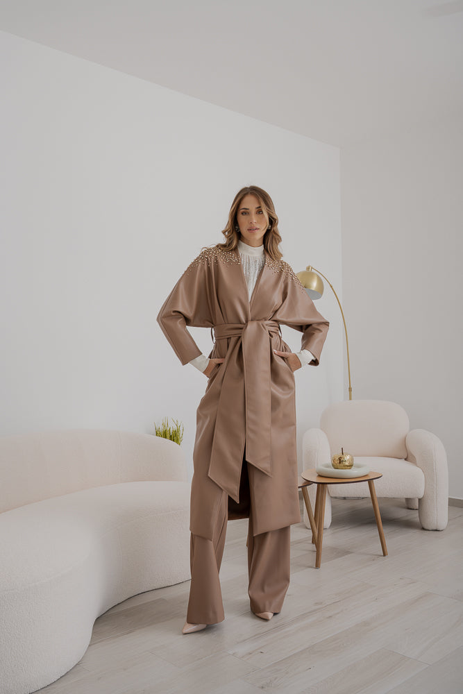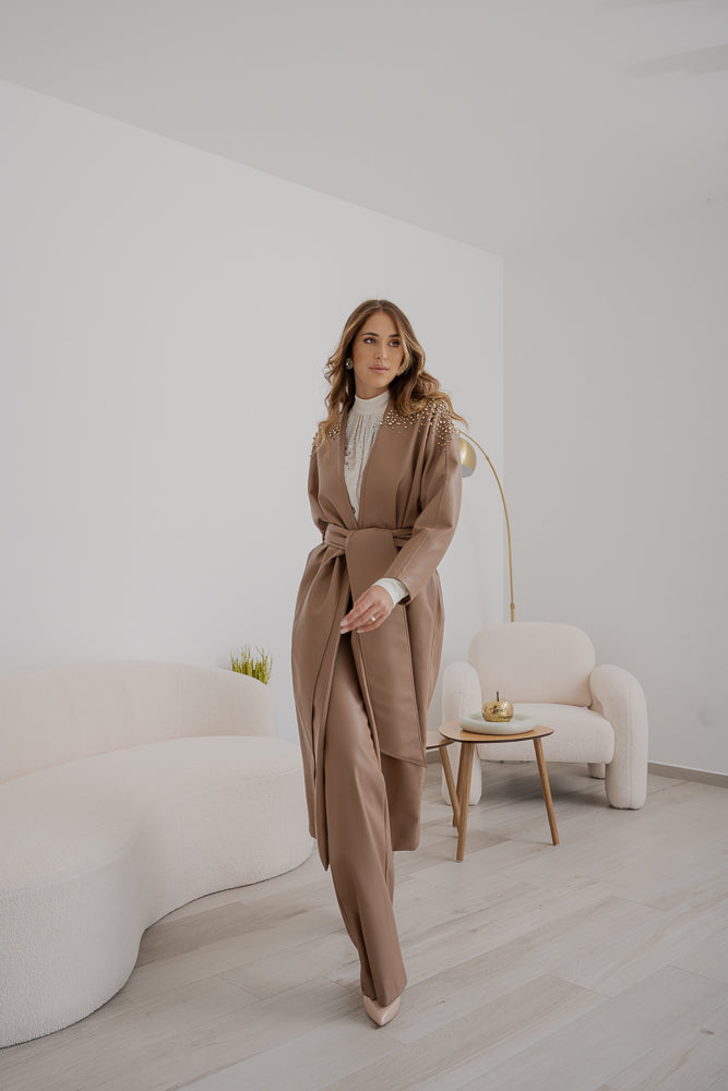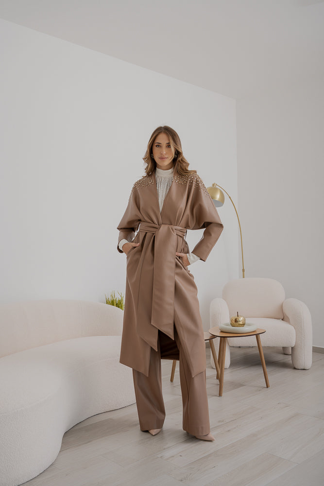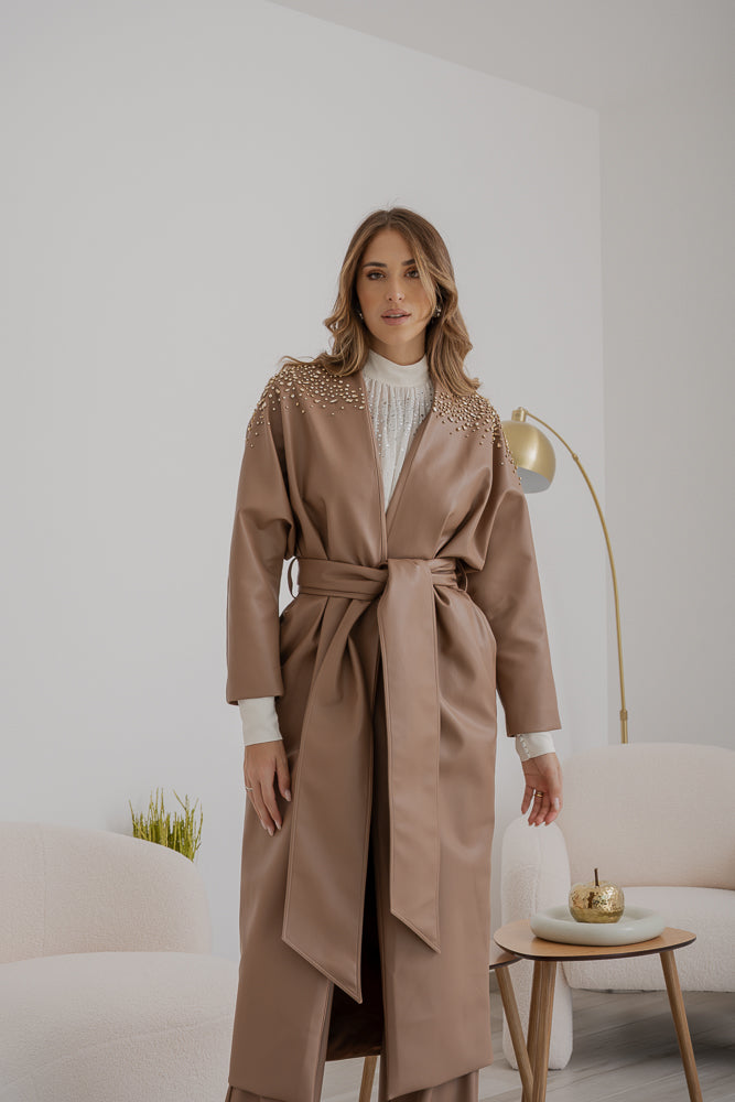 Trench Sabelle in ecopelle color cammello, chiusura con cintura coordinata che segna il punto vita e maniche ampie dal taglio dritto. Spalle e parte superiore arricchite da cristalli applicati.